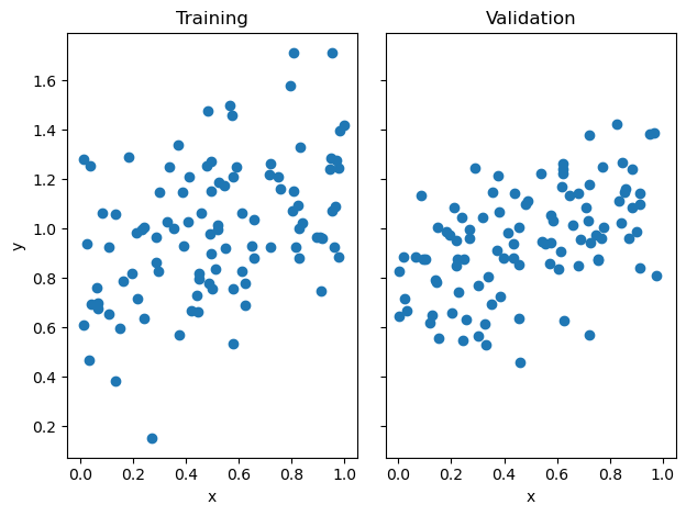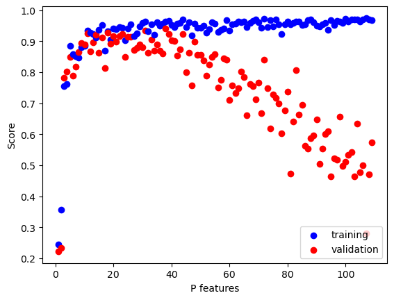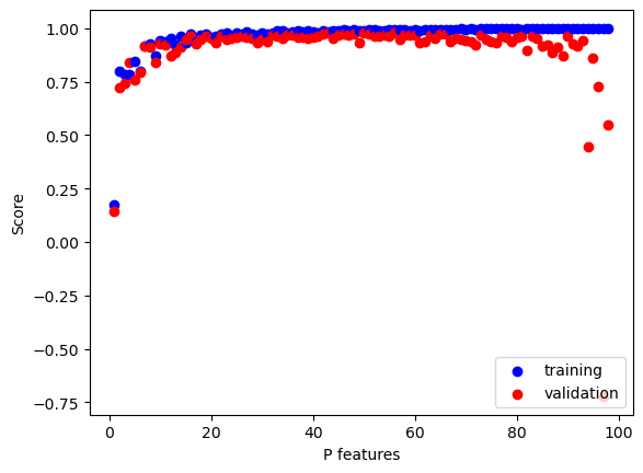 #increasing p_features p_features = n_train -1for p inrange(1, p_features):#generate data X_train, y_train, X_val, y_val = LR_data(n_train, n_val, p, noise)#fit data to linear regression model LR3 = LinearRegression() LR3.fit_analytic(X_train, y_train) #score the model score_train = LR3.score(X_train, y_train) score_val = LR3.score(X_val, y_val)if p ==1: plt.scatter(p, score_train, color ="blue", label ="training") plt.scatter(p, score_val, color ="red", label ="validation") else: plt.scatter(p, score_train, color ="blue") plt.scatter(p, score_val, color ="red") #plotlabels = plt.gca().set(xlabel ="P features", ylabel ="Score")legend = plt.legend(loc='lower right')