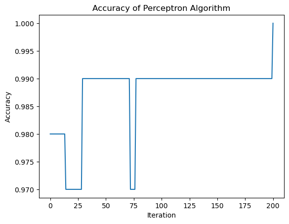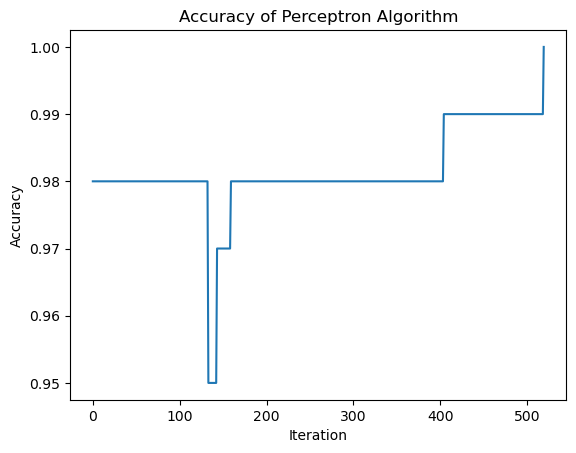 p_features =6X_5, y_5 = make_blobs(n_samples =100, n_features = p_features -1, centers = [(-1.7, -1.7), (1.7, 1.7)])p = Perceptron()p.fit(X_5, y_5, max_steps =1000)p.wprint("Evolution of the score over the training period:") print(p.history[-10:]) #just the last few scoresfig = plt.plot(p.history)xlab = plt.xlabel("Iteration")ylab = plt.ylabel("Accuracy")title = plt.title("Accuracy of Perceptron Algorithm")