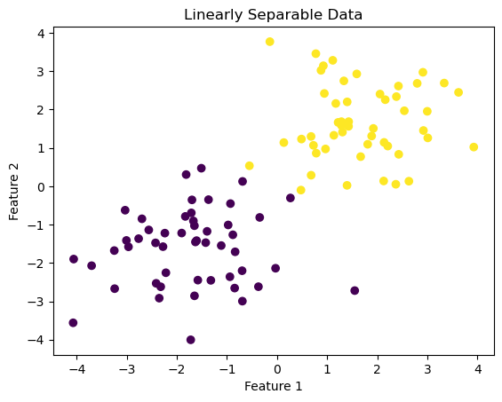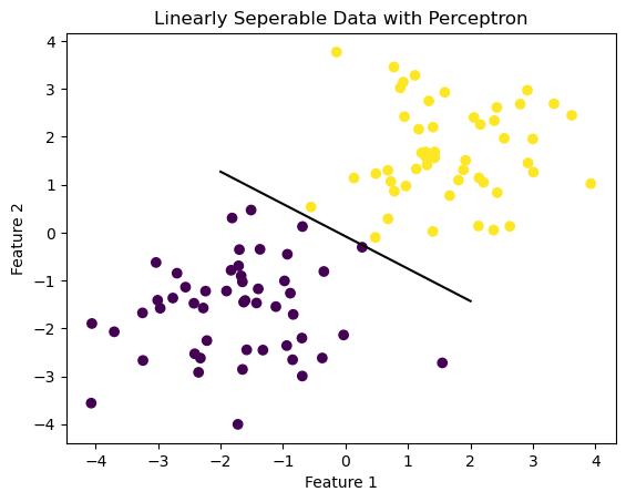 def draw_line(w, x_min, x_max): x = np.linspace(x_min, x_max, 101) y =-(w[0]*x + w[2])/w[1] plt.plot(x, y, color ="black")fig = plt.scatter(X[:,0], X[:,1], c = y)fig = draw_line(p.w, -2, 2)xlab = plt.xlabel("Feature 1")ylab = plt.ylabel("Feature 2")plt.title("Linearly Seperable Data with Perceptron")plt.savefig("image.jpg")