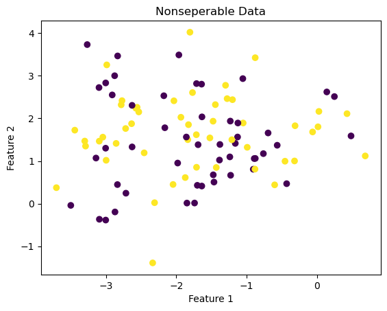 Now suppose that \((X, y)\) is not linearly separable. In this case, the perceptron update will not converge. Below is an example of some nonseparable data with 2 features on which we will apply the perceptron on.