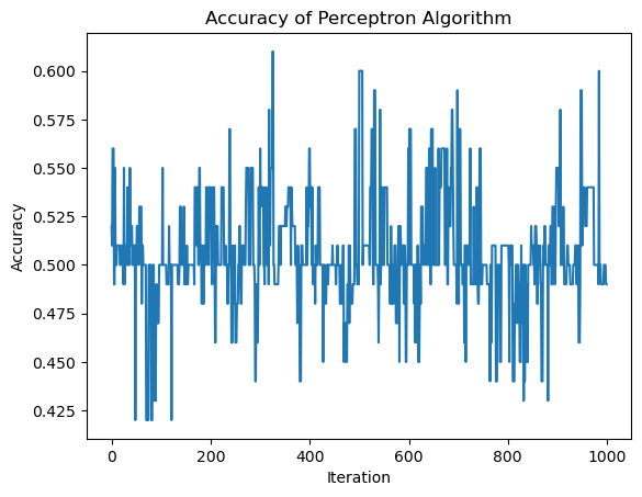 p = Perceptron()p.fit(X_n, y_n, max_steps =1000)p.wprint("Evolution of the score over the training period:") print(p.history[-10:]) #just the last few scoresfig = plt.plot(p.history)xlab = plt.xlabel("Iteration")ylab = plt.ylabel("Accuracy")title = plt.title("Accuracy of Perceptron Algorithm")