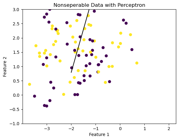 fig = plt.scatter(X_n[:,0], X_n[:,1], c = y_n)fig = draw_line(p.w, -2, 2)xlab = plt.xlabel("Feature 1")ylab = plt.ylabel("Feature 2")plt.ylim(-1,3)title = plt.title("Nonseperable Data with Perceptron")